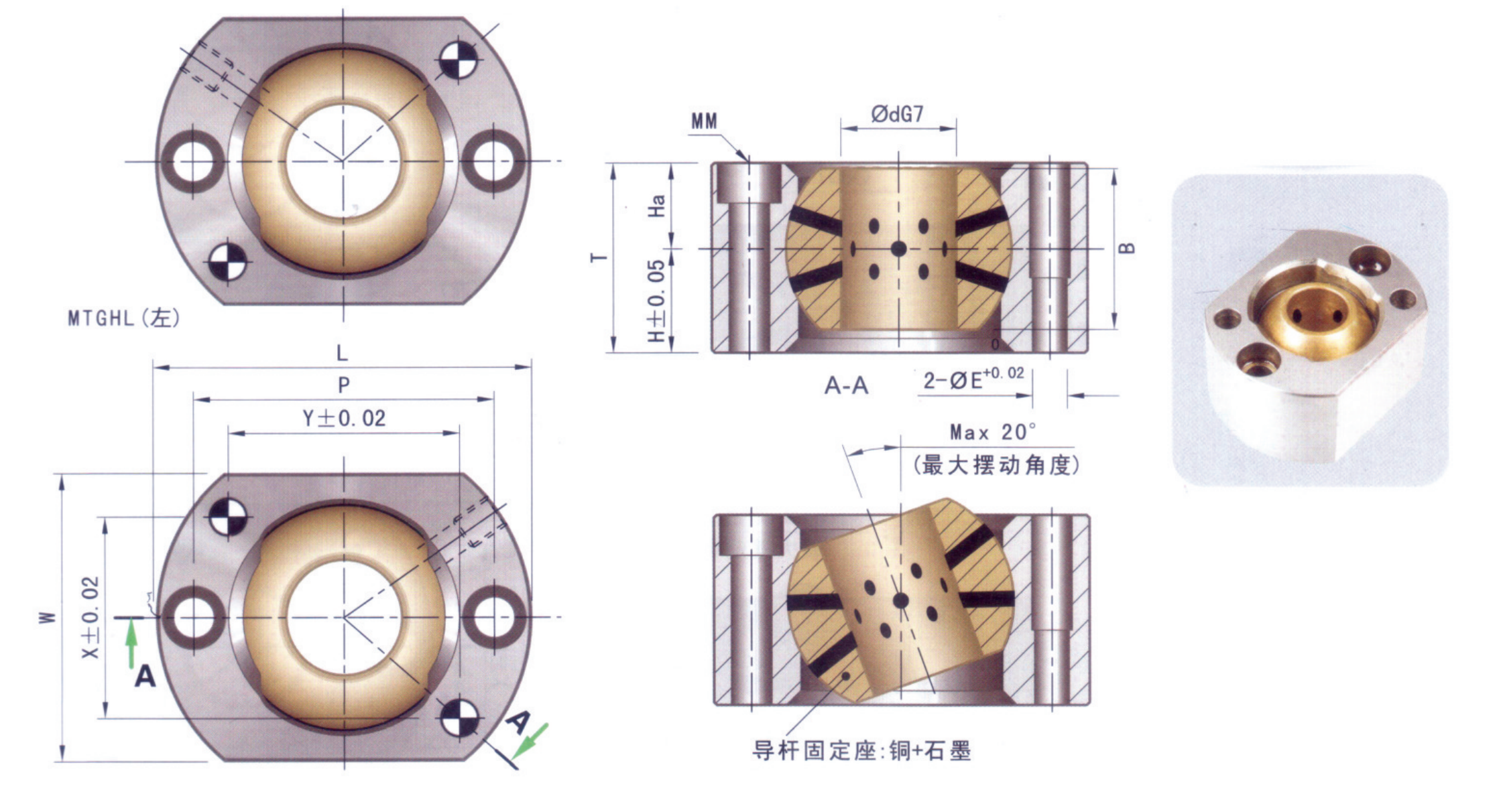 2.內部球形的銅導滑桿固定座具有20°傾斜度的擺動,十分便于安裝;鑲石墨的設計,減少斜導桿在移動中的 磨損和卡傷;