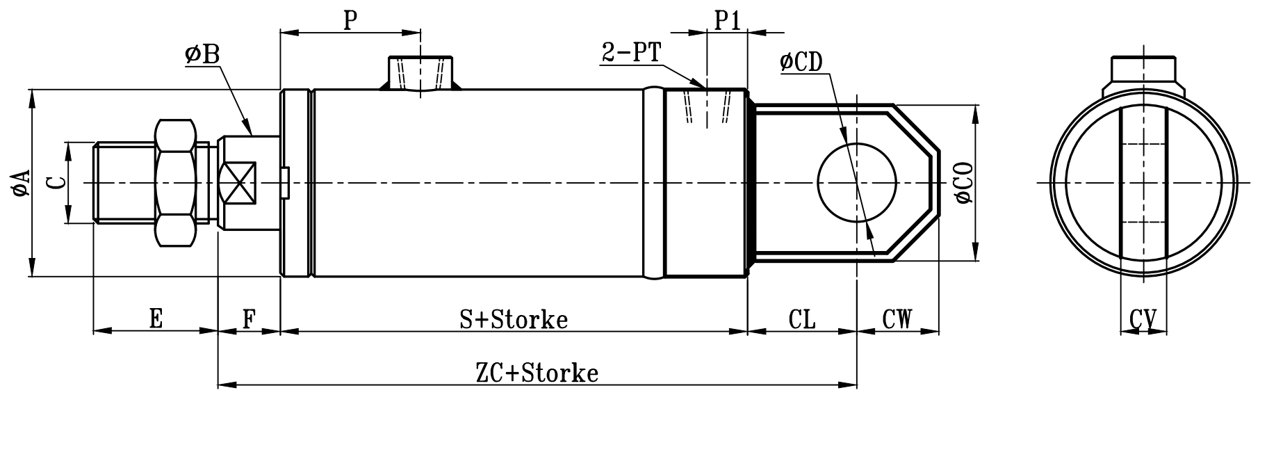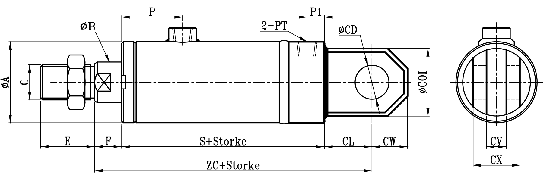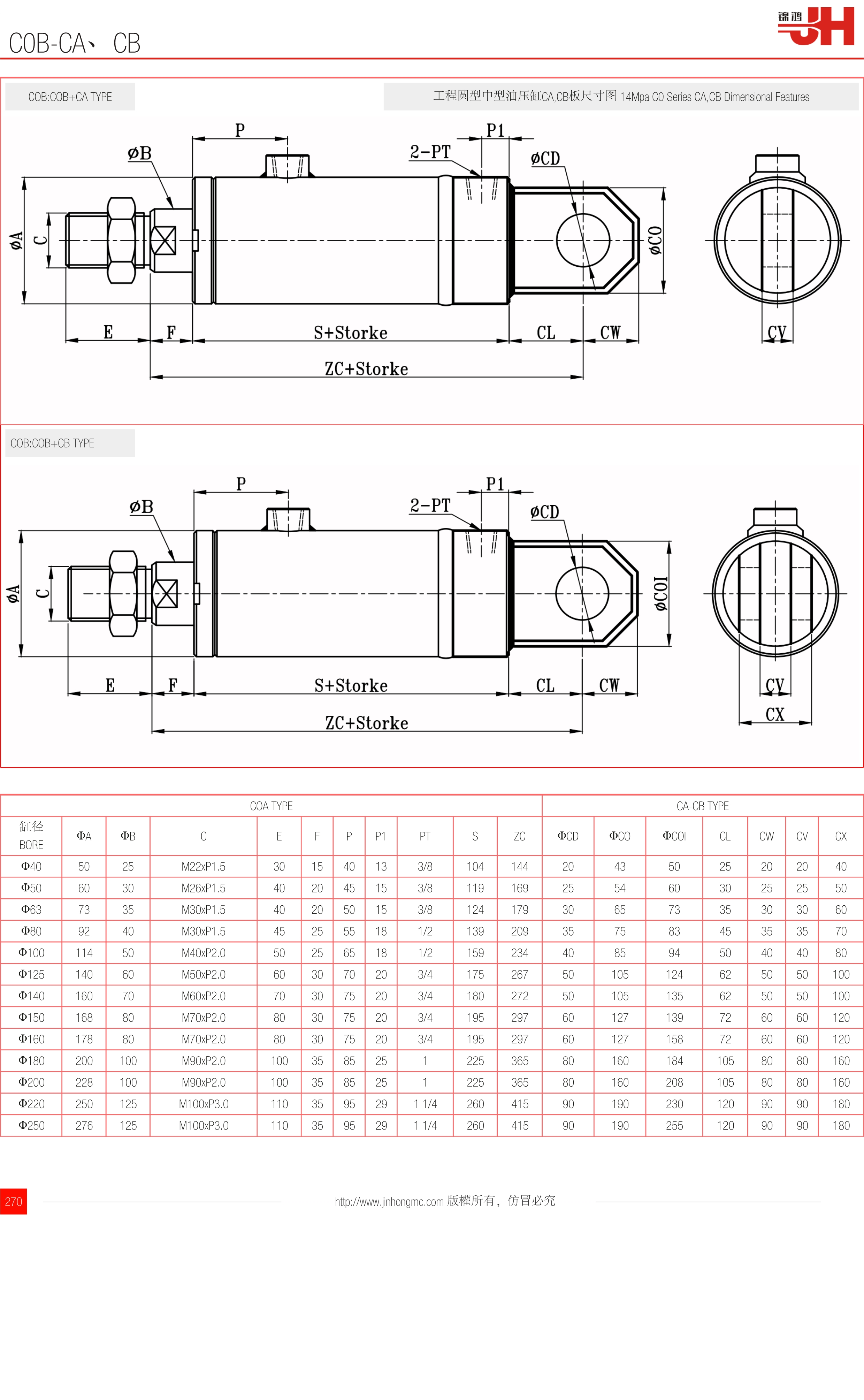 | 缸徑 BORE | ΦA | ΦB | C | E | F | P | P1 | PT | S | ZC | ΦCD | ΦCO | ΦCOI | CL | CW | CV | CX |